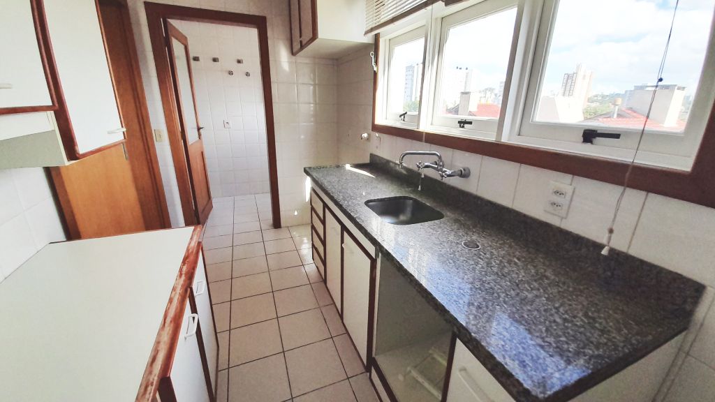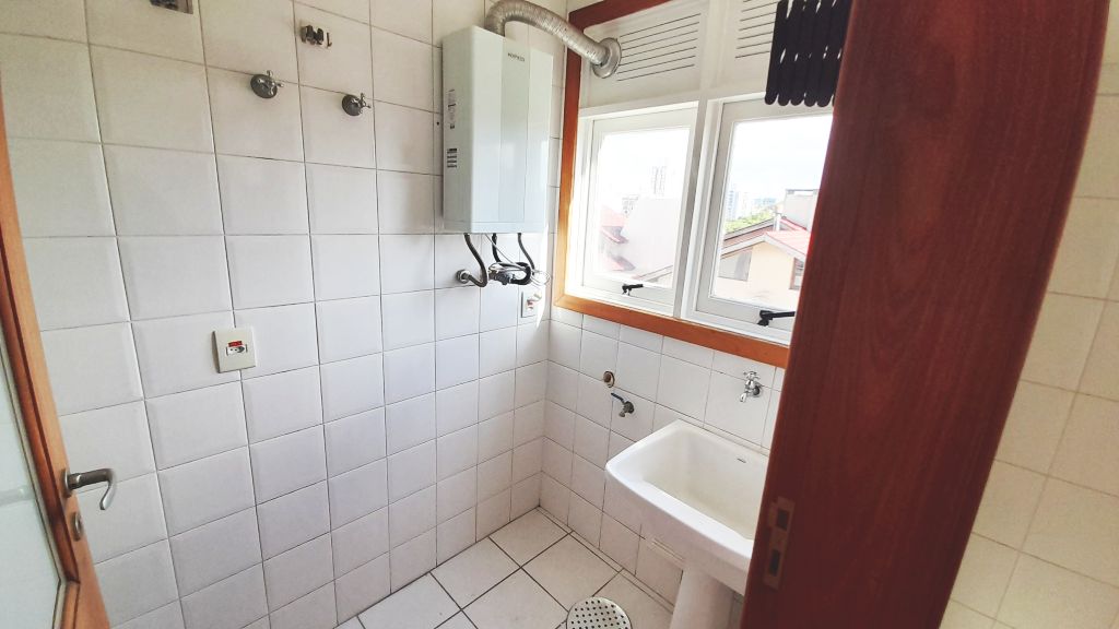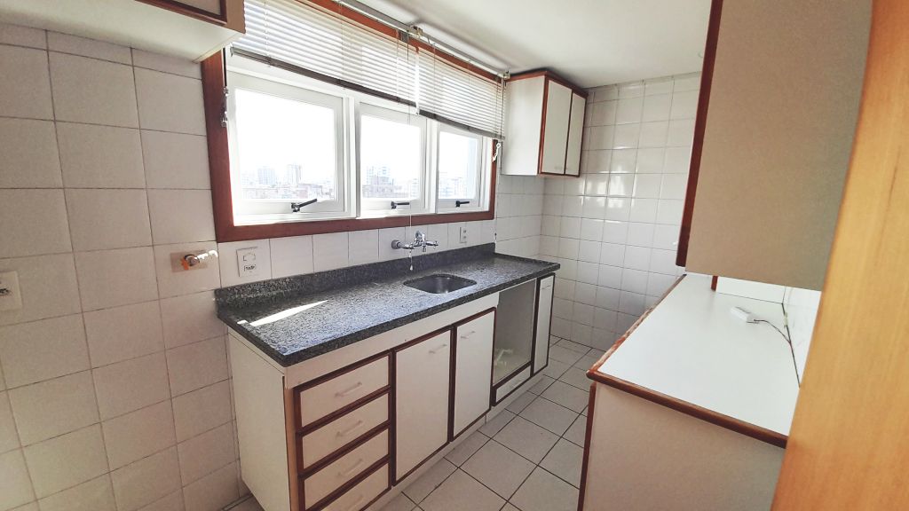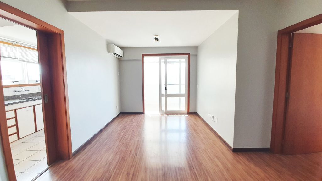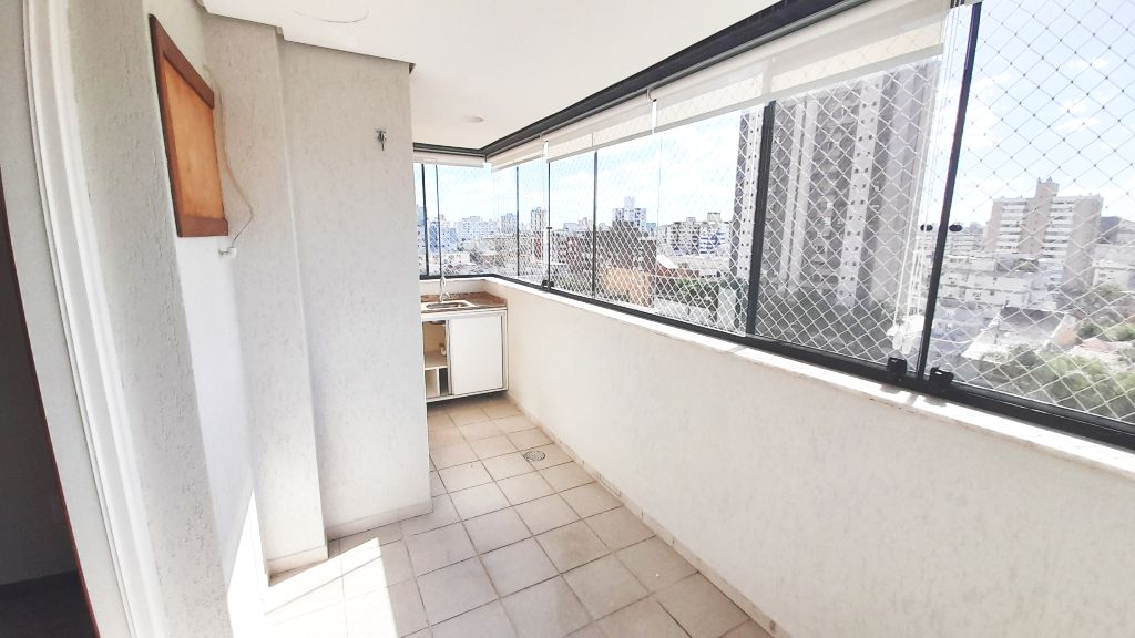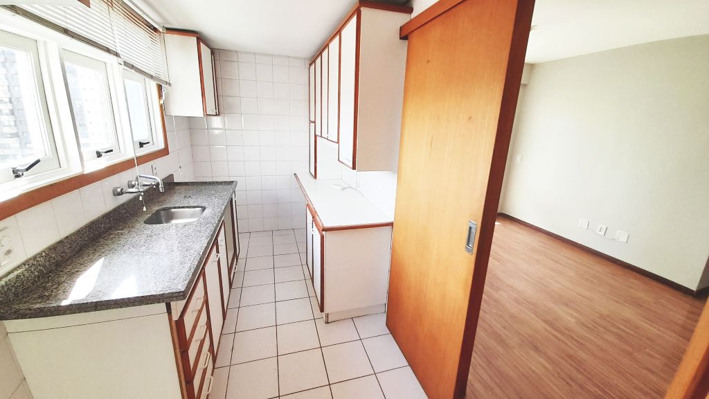 Excelente apartamento de fundos, sétimo andar, piso laminado, de três quartos, sendo uma suíte, sala, cozinha, banheiro social, com ar condicionado. Claro, ventilado, amplo, varanda com churrasqueira. Área de serviço fechada e uma vaga de garagem. Prédio com elevador, salão de festas e interfone com monitoramento por vídeo. Taxas R$1400,00.